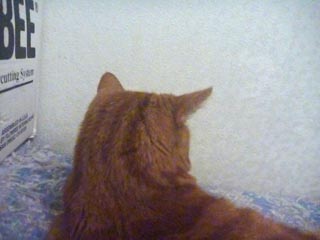 今日も撮れたてほやほやのジャイ選手。左の箱はフロービーです。 この箱はジャイ選手が頭の上に回り込もうとするのを阻止するために置いてあるのですが、 この髪切りマシーンは夏の猛暑の中に置いておいたら動かなくなった経験があり、 そういう意味でもこの部屋に置いておいたのです。今年の夏は動かなくなりそうです。