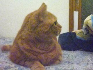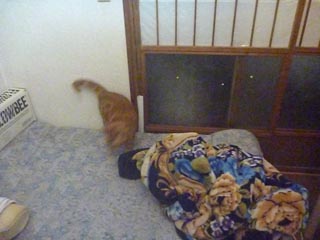 撮れたてのジャイ選手を撮ろうと思ったけれど見当たらなくてデジカメ持って立ち上がったら、 椅子の真後ろから飛び出してソファーの上に避難した瞬間のジャイ選手です。危うく轢く所でした…。 どうも椅子の近くでくつろぐのが好きみたいなんですよね。