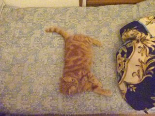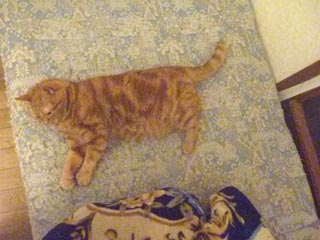 昨日の頭付け寝に続きもう1つ頭付け寝を記録していますが、それは差し置いて今朝、早朝のジャイ選手。 何気に美しい絵になる構図をしていますが、だから撮った訳ではありません。 ジャイ選手が例によって「無駄な机に向かってないでソファーで寝ろ!ニャア〜」と鳴くものですから、 しょうがねぇにゃとソファーに向かってみればコレですよ。呼ぶならソファーを占拠すんにゃと私は言いたい。 この矛盾した行動、地震の予知だったのかもしれない。