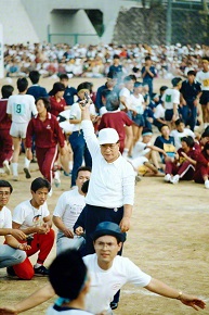 第4回健康祭で、池田先生が合図のピストルを鳴らす(1985年10月10日、大阪・交野市の関西創価学園で)